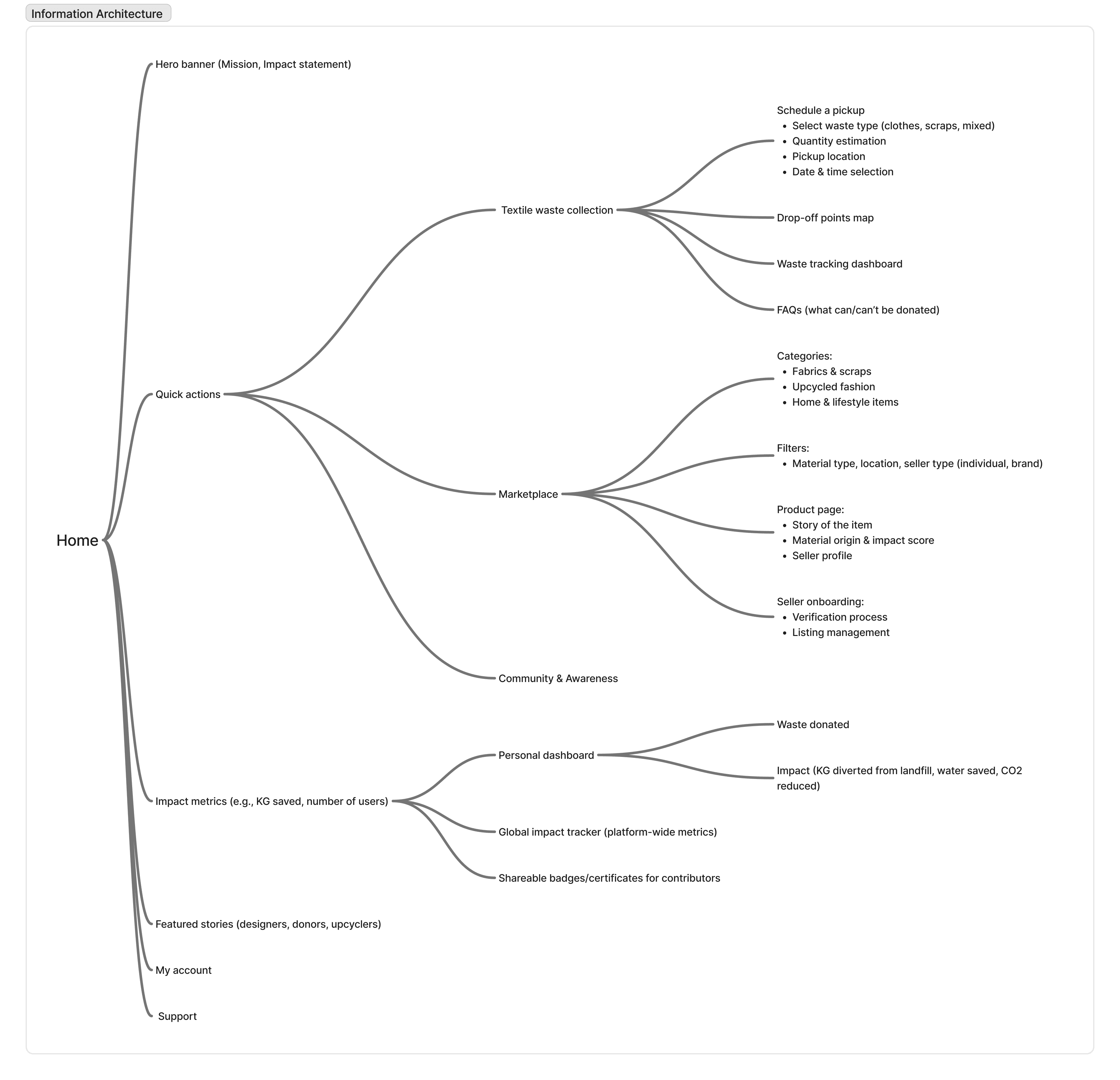 To ensure ThreadCircle addresses the needs of donors, buyers, and upcyclers, we mapped a clear Information Architecture that organizes the platform into intuitive sections. Each section directly supports user goals uncovered in our research—whether it’s scheduling waste pickups, browsing sustainable products, tracking impact, or learning about textile waste. This structure allows for a smooth user flow, keeps core actions easily accessible, and is scalable to add future features as the platform grows.